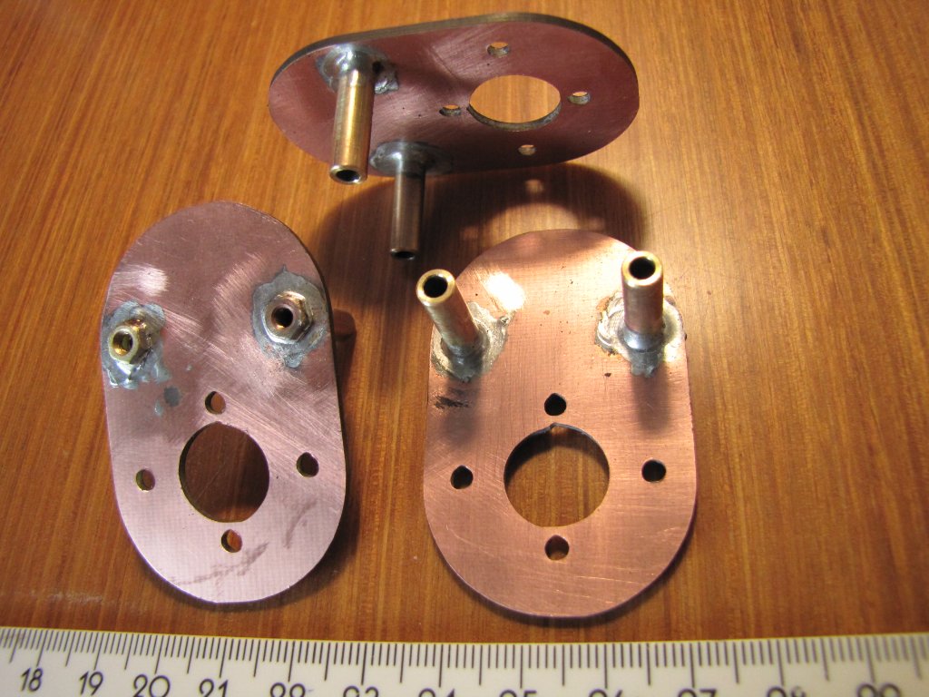 Nachdem die Distanzhülsen fertig waren konnte das Aggregat zusammengebaut werden. Zur leichteren Montage habe ich die langen Schrauben von der anderen Seite eingesetzt und die Muttern und Hülsen mit der Trägerplatte verlötet.